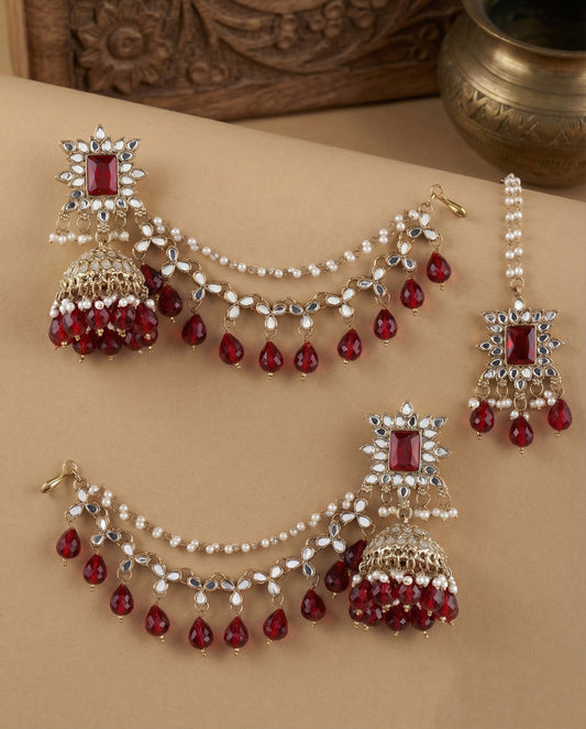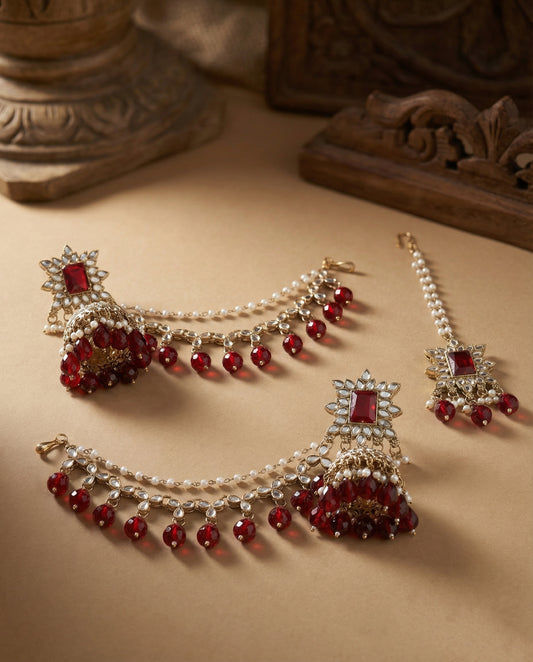 Maroon Aayat Bahubali Jhumka with Statement Kaan Chain and Teeka