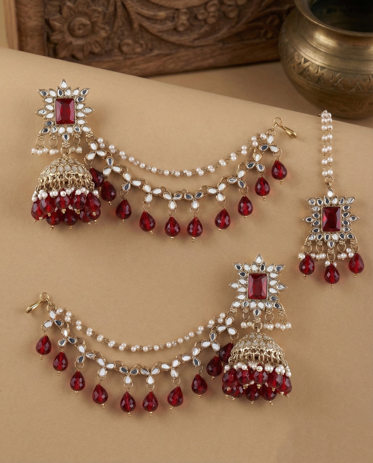 Maroon Kaur Mirror Bahubali Jhumka with Statement Kaan Chain and Teeka