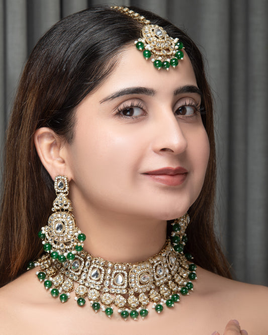 Emerald Arshiya Premium Polki Dupe Necklace with Earring and Teeka