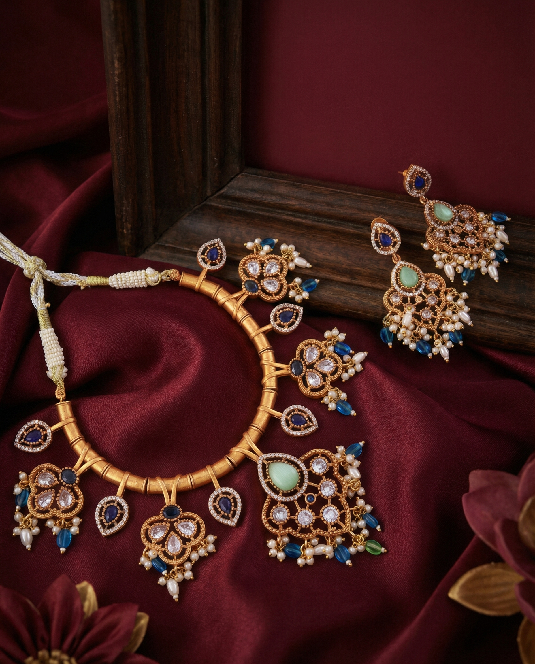 Blue Mint Green Tayaba Collar Necklace Set With Earring