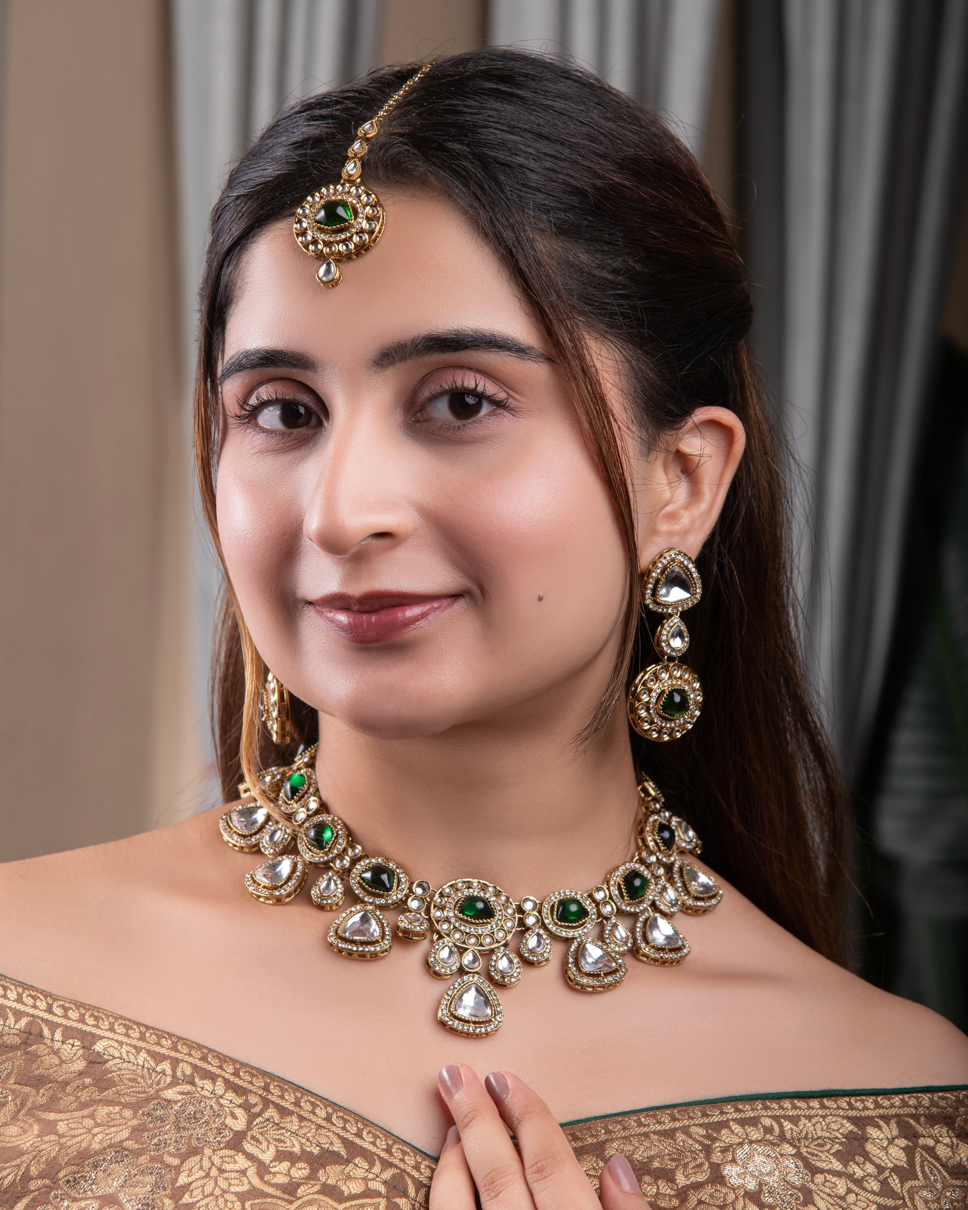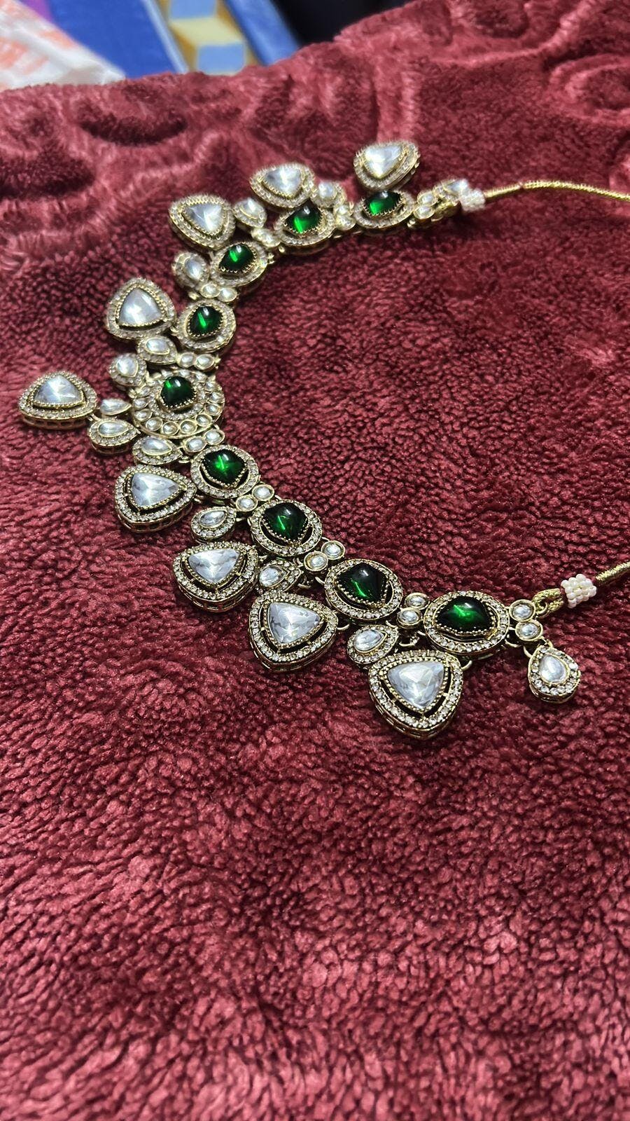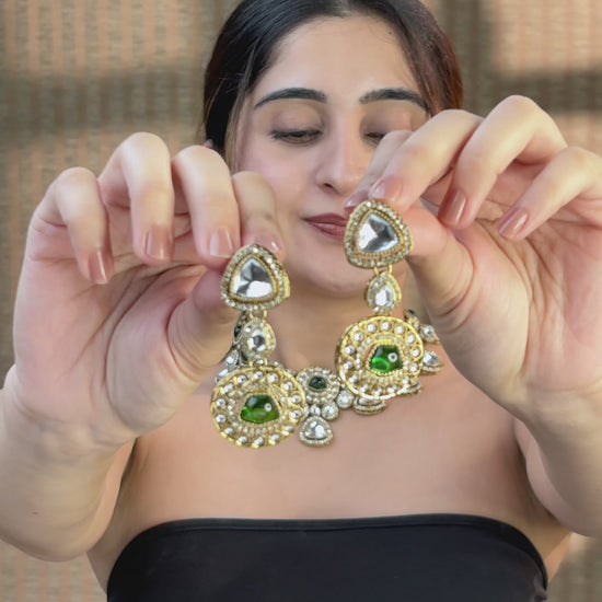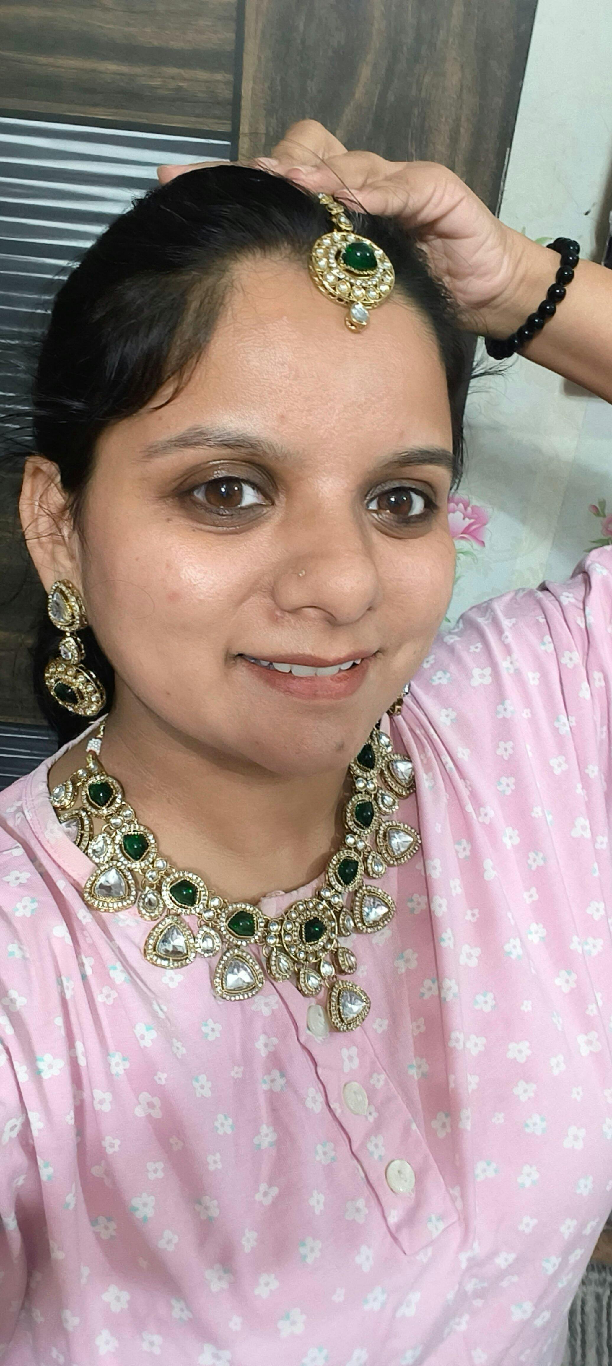 Green Kavita Premium Polki Dupe Necklace with Earring and Teeka