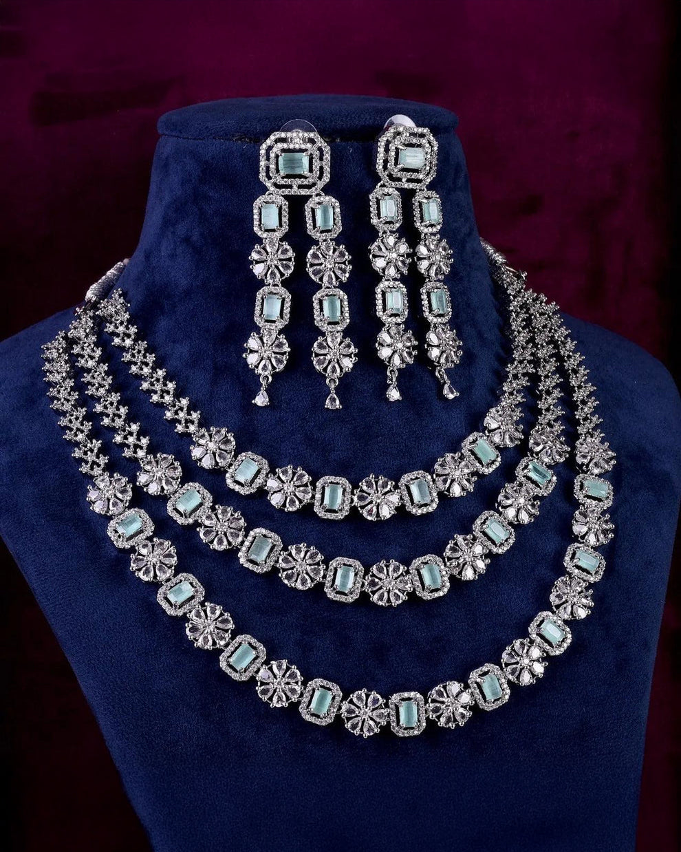Mint Green Salina 3 Layer American Diamond Necklace Set