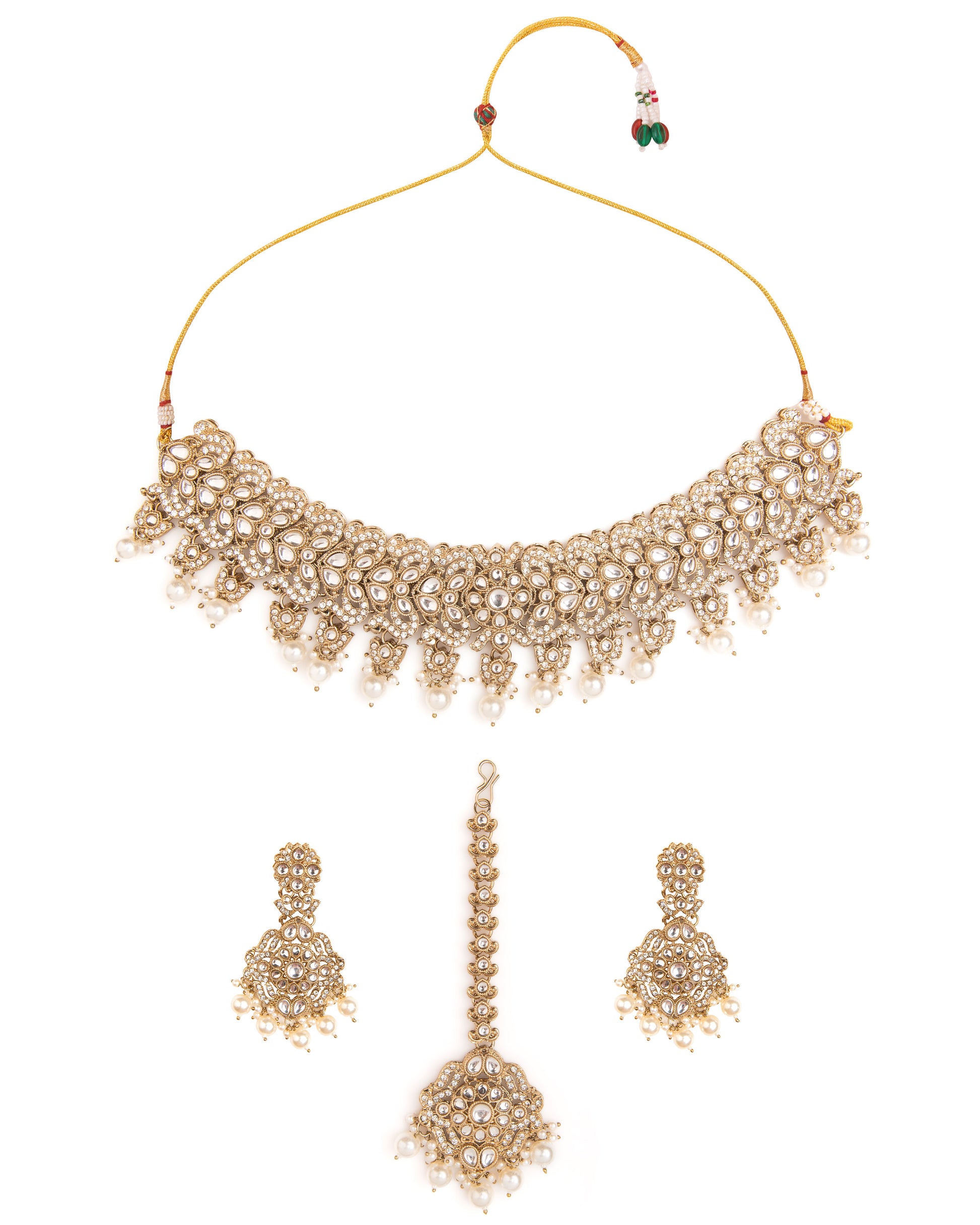 Pearl Shravya Premium Polki Dupe Necklace with Earring and Teeka