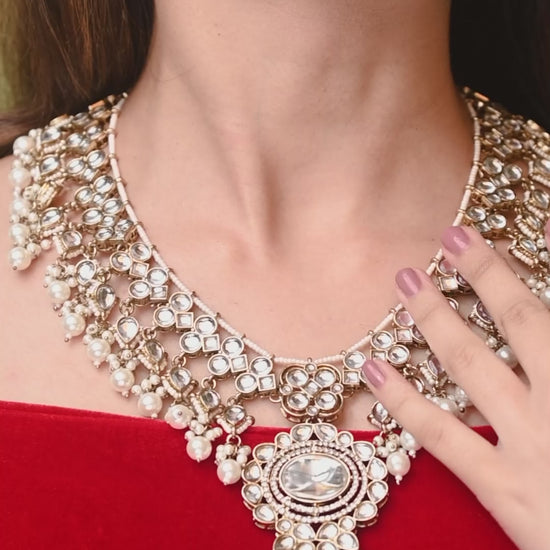 Prayshi Premium Kundan Pearl Necklace With Earring and Teeka