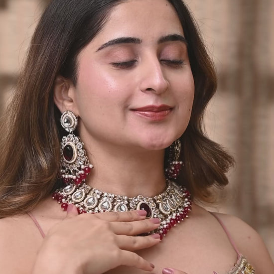 Red Kavisha Premium Polki Dupe Necklace Set with Earring and Teeka