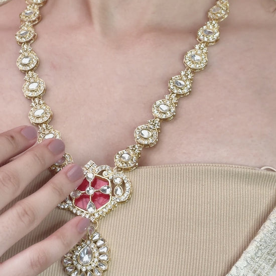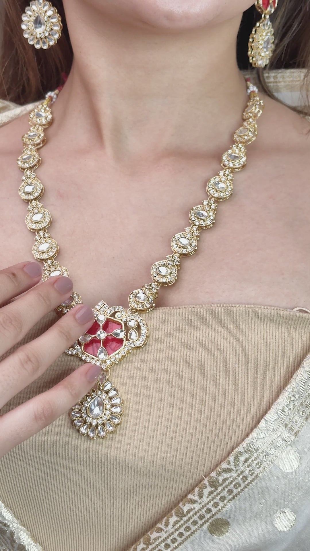 Red Vrinda Long Necklace Set with Earring and Teeka