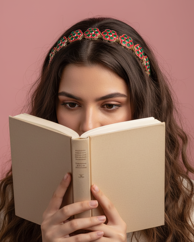 A gold plated thick Kundan hair band for those who want a heavy look with a subtle touch