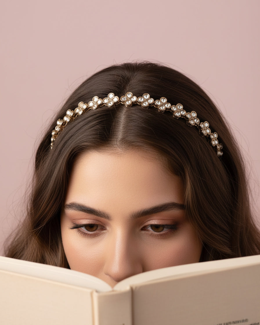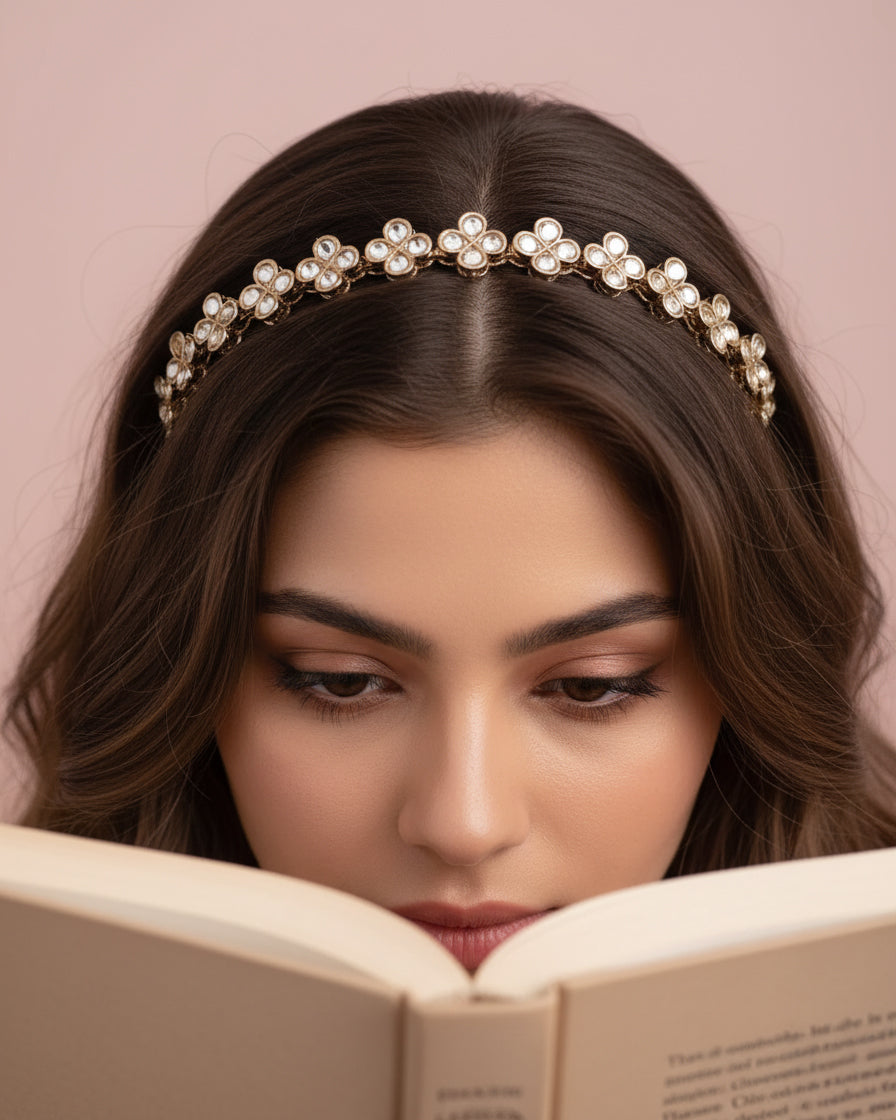 A gold plated thick Kundan hair band for those who want a heavy look with a subtle touch