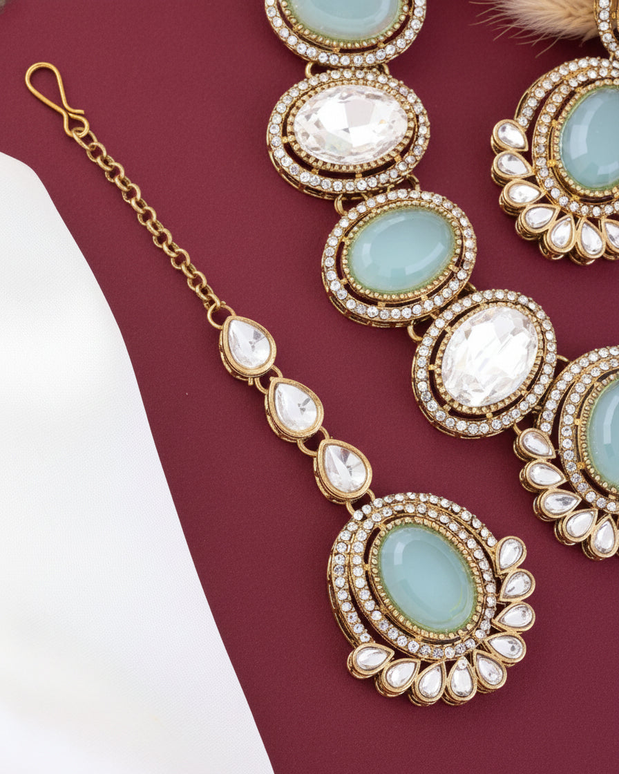 Turquoise Parnika Premium Polki Dupe Necklace with Earring and Mangteeka